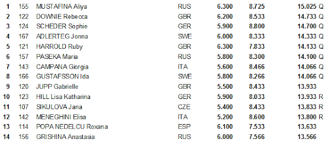 Yet all three qualifications all arounders suffered errors and at times looked to lack fitness, at a time when the sport demands more and more of its practitioners in terms of reliability and athleticism. Choreographic passages were omitted from floor exericses to preserve energy for the tumbles. Afanasyeva still performed with ambition and commitment on this piece, but a fall to her side on bars dismount, not surprisingly, led to a dispirited beam outcome. All three all arounders suffered falls in their programmes. I expect that the two qualified gymnasts (Grishina and Mustafina) wlll do better in the all around, and I so would like to see Afanasyeva win floor, but then I am an optimist.
